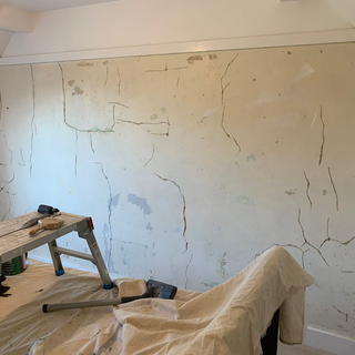 After completing a living room for this client we were instructed to decorate a further two rooms, after the client removed the wallpaper the walls were in a pretty bad state. The ceiling’s were sanded then prepared followed by two coats of macphersons eclipse in a brilliant white. we then removed the rest of the little bits of wallpaper from the walls and used our dust free sander to take any high stops down to wall level. We then applied a generous coat of Zinsser peel stop to stabilise the wall of any loose debris and old flaking paint. Once dried we skimmed the imperfections using easi-fill then allowed to dry over night. After another sand with our dust free sander we applied a coat of johnstones covaplus to the walls and allowed to dry naturally, once dried we fine filled the imperfections before applying another two coats of covaplus to give a nice flat finish to what were terrible walls. The woodwork in the room was sanded, filled and undercoated before applying two coats of brilliant white satin wood for a crisp clean finish.